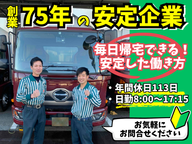 従業員の頑張りに対してしっかりと還元しています。 年2回の賞与をはじめ、 配偶者手当や子ども手当も毎月ご用意。 また資格取得支援制度を活用し、 大型免許やフォークリフト免許などが 会社全額負担で取得可能◎ 業務に慣れてきたら、大型免許を取得し、 キャリアアップを目指すことも可能ですよ! 福利厚生については、 従業員からも嬉しい声が多数上がっています! 「安定している企業で働きたい」という方、 是非ご応募お待ちしております。 |